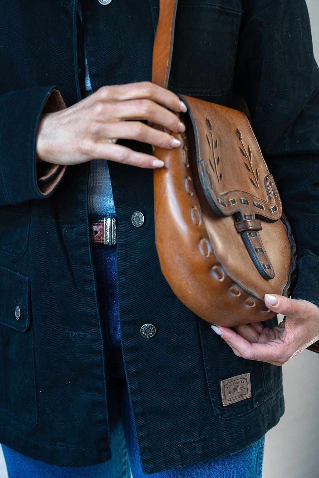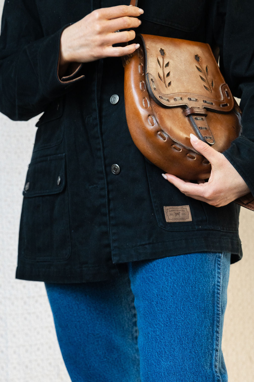 A thick leather bag with a great structure. The 70's aesthetic of the floral inlay on the front flap in black with black accents around the bag itself. The strap lends more to a shoulder strap, but could also be a crossbody.