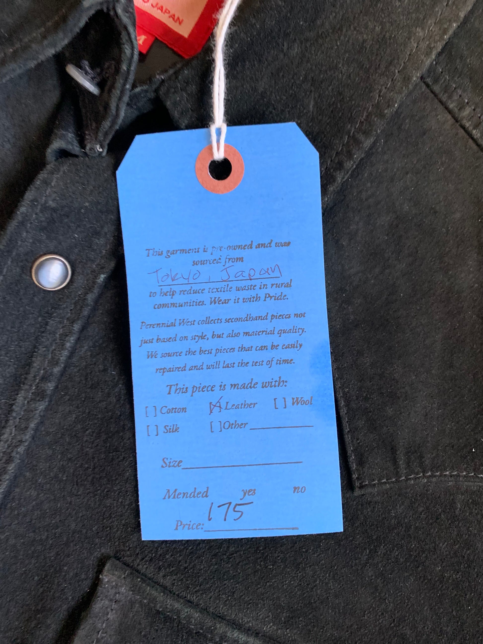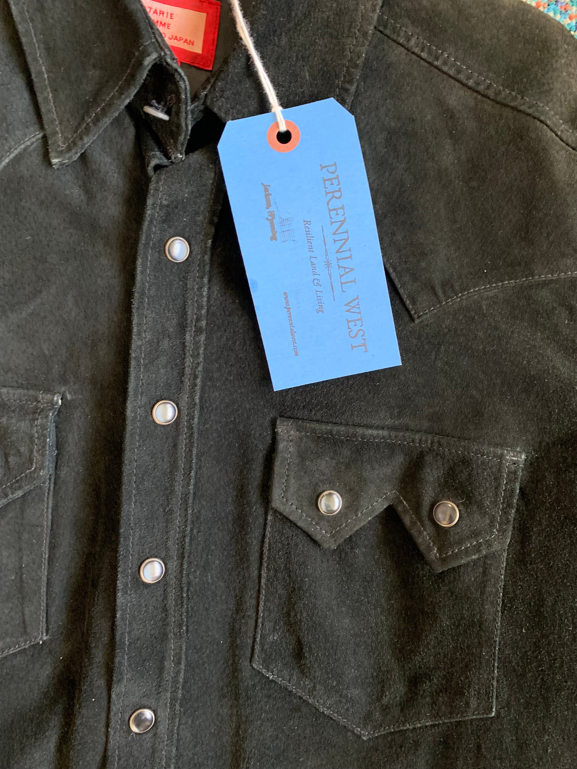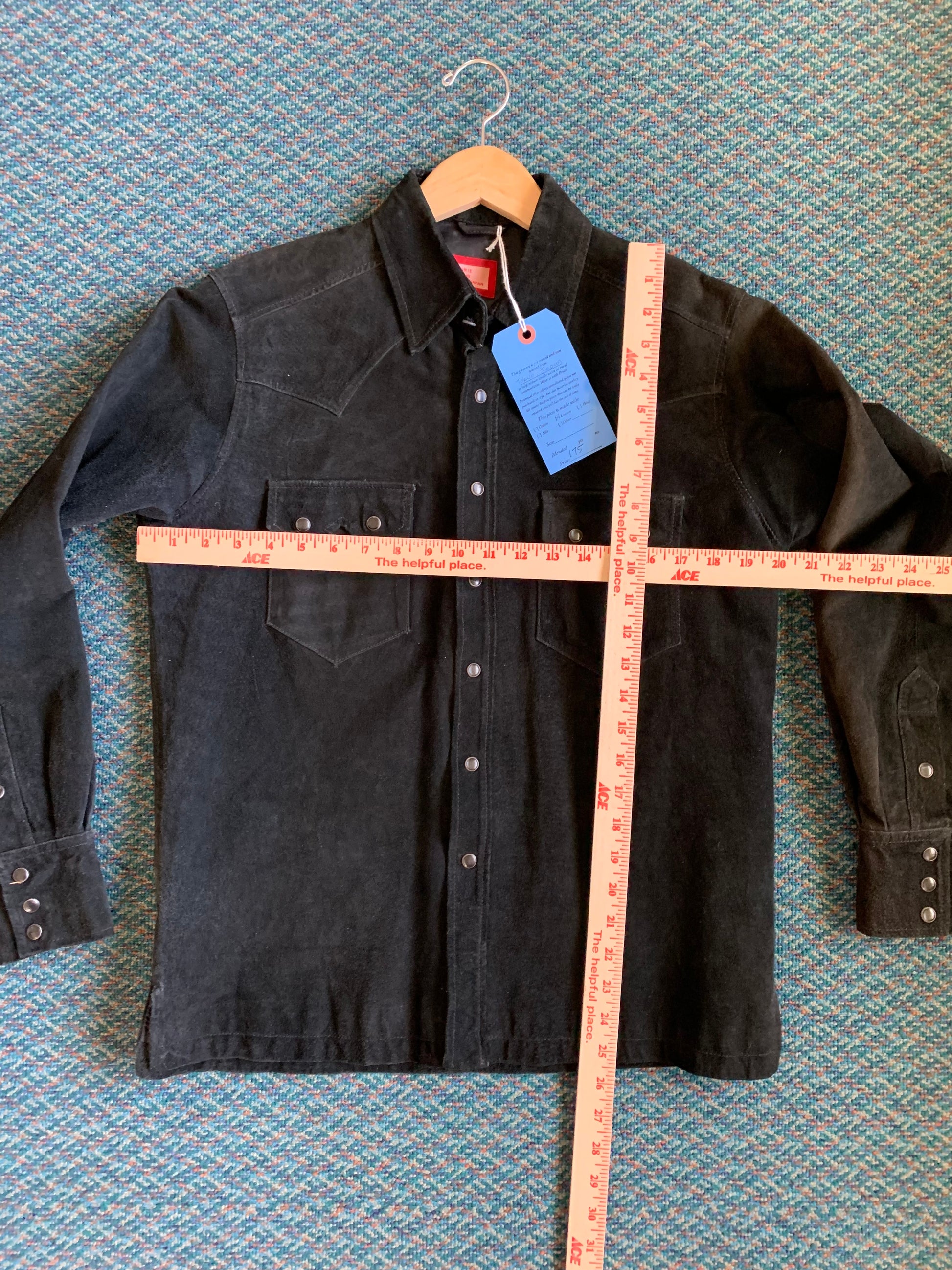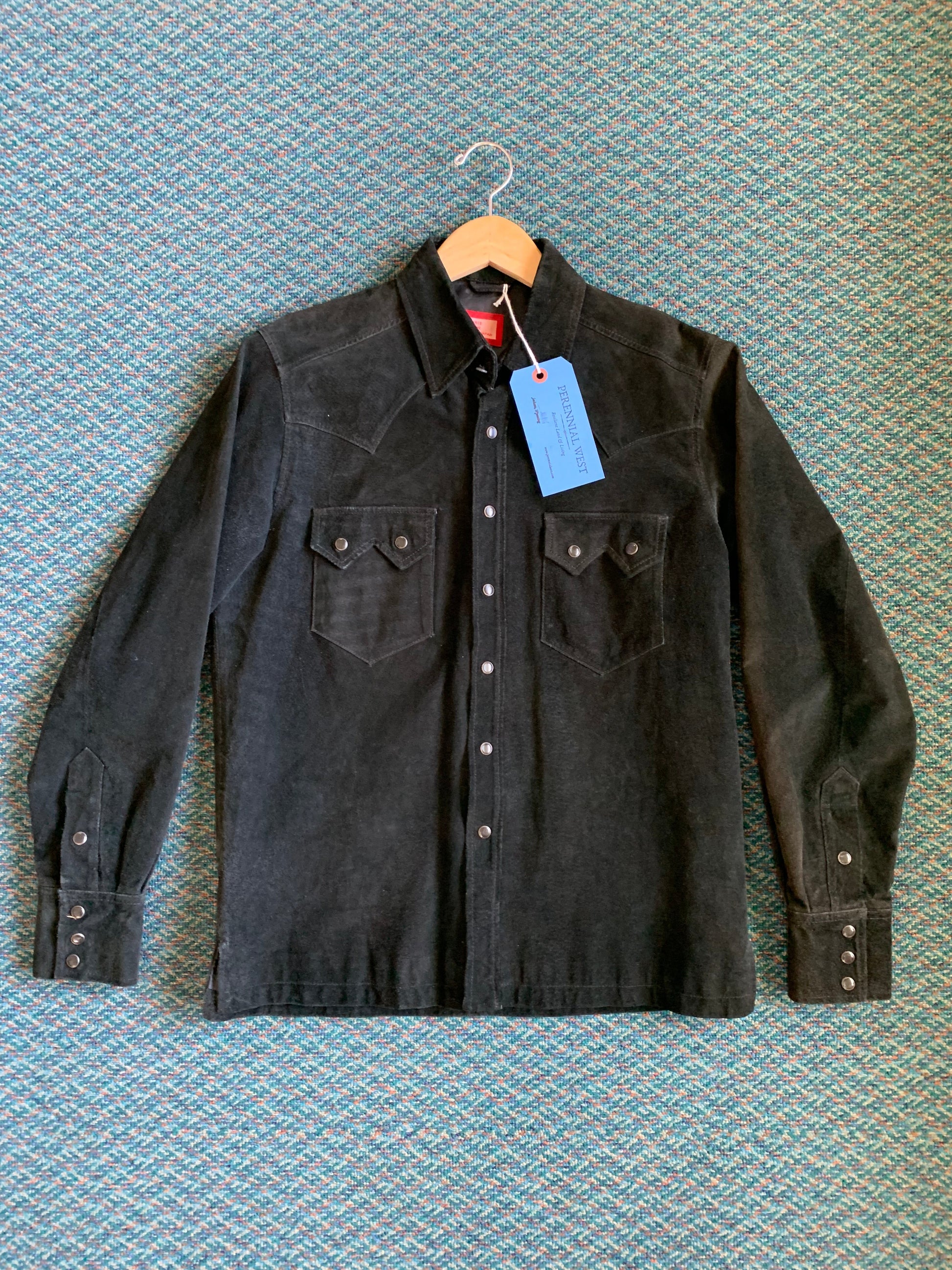 A great black suede piece with pearl snap button down and western flap pockets. The western vibe of this piece is perfect from Spring to Fall. Light fading at the shoulders gives it extra character. Unisex size large. I'd pair this with a pair of denim and a cute tank.