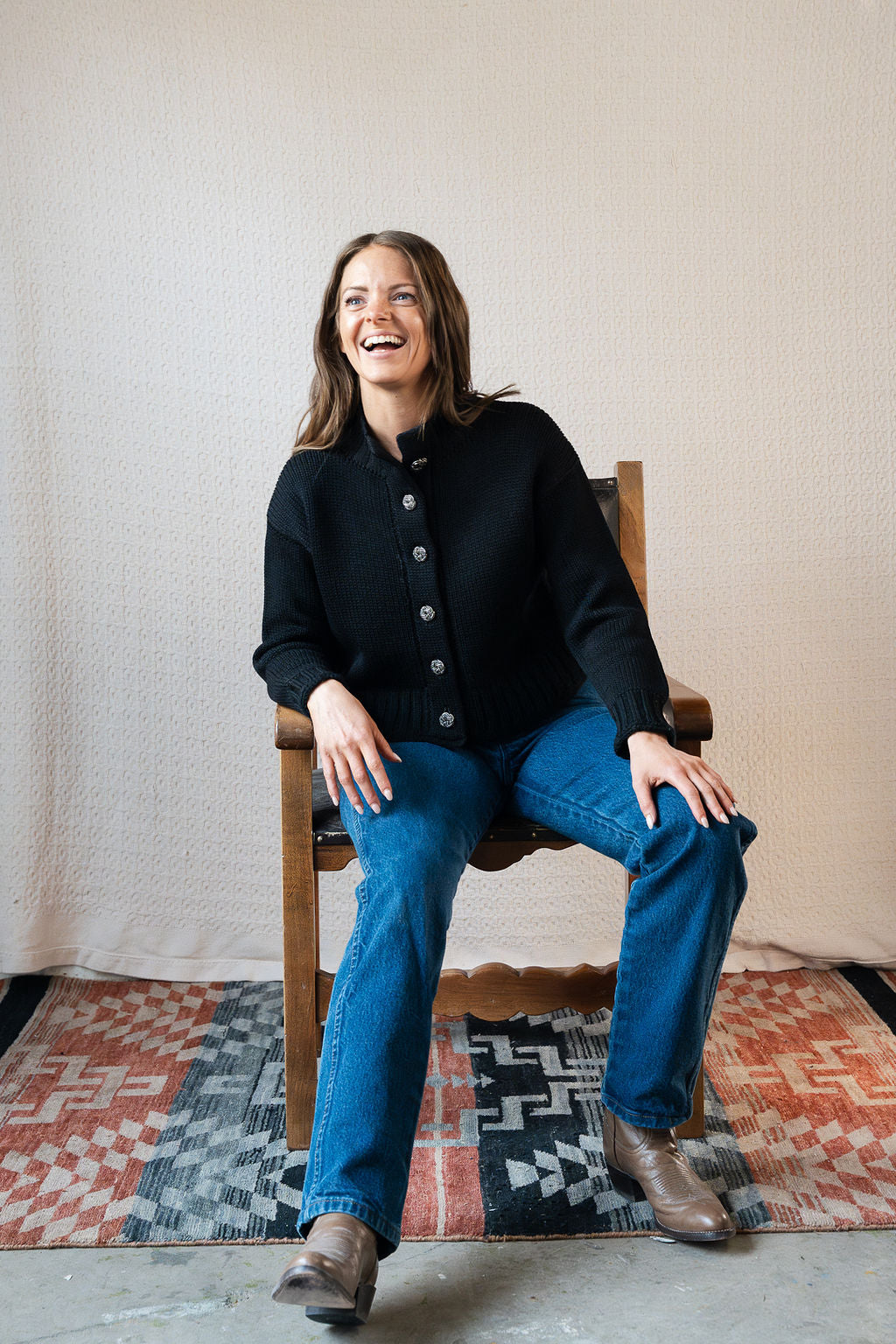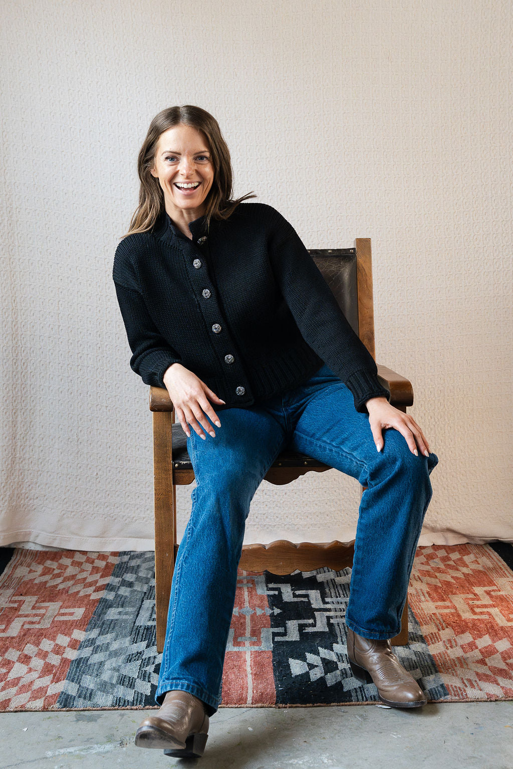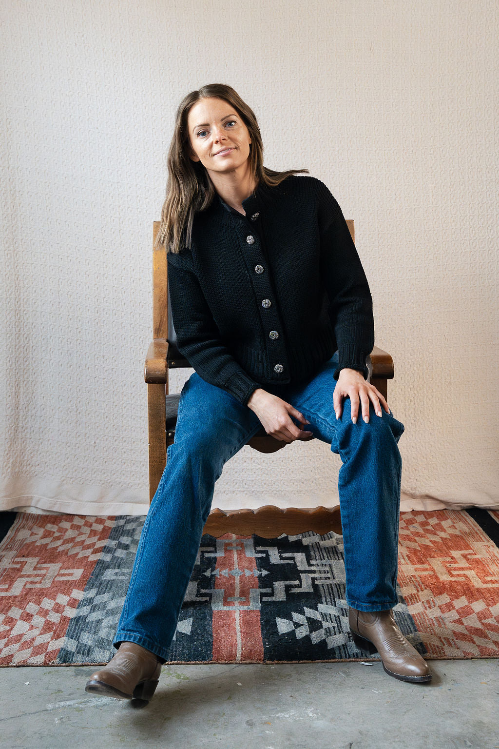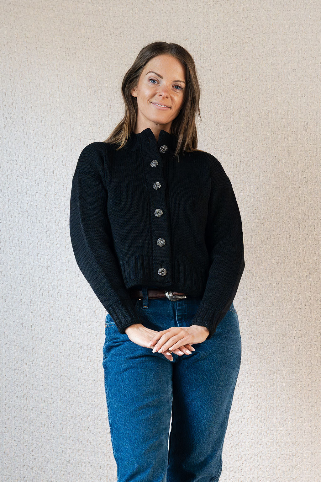 A beautiful old piece that we can't believe we found in such amazing condition! This black knit features silver sequin embellished floral style buttons, a mock neckline, and a cropped style body fit. Originally from Bullocks Wilshire's Collegienne line, it was made by Geistex and is 100% wool, but not itchy. We chose this to fit the coastal grandma vibe that plays into our collections.