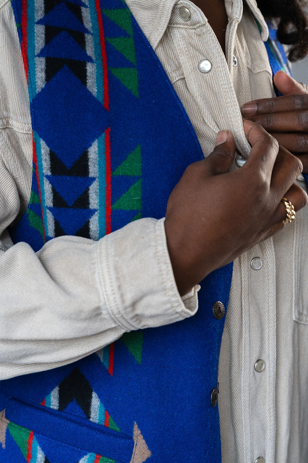 A beautiful Southwest pattern Pendleton vest in blue with multi-color detail. We love layering statement vests over the top of basic button downs, but also denim jackets, ala Ralph Lauren. Tagged a men's size 40, but fits like a unisex size medium.