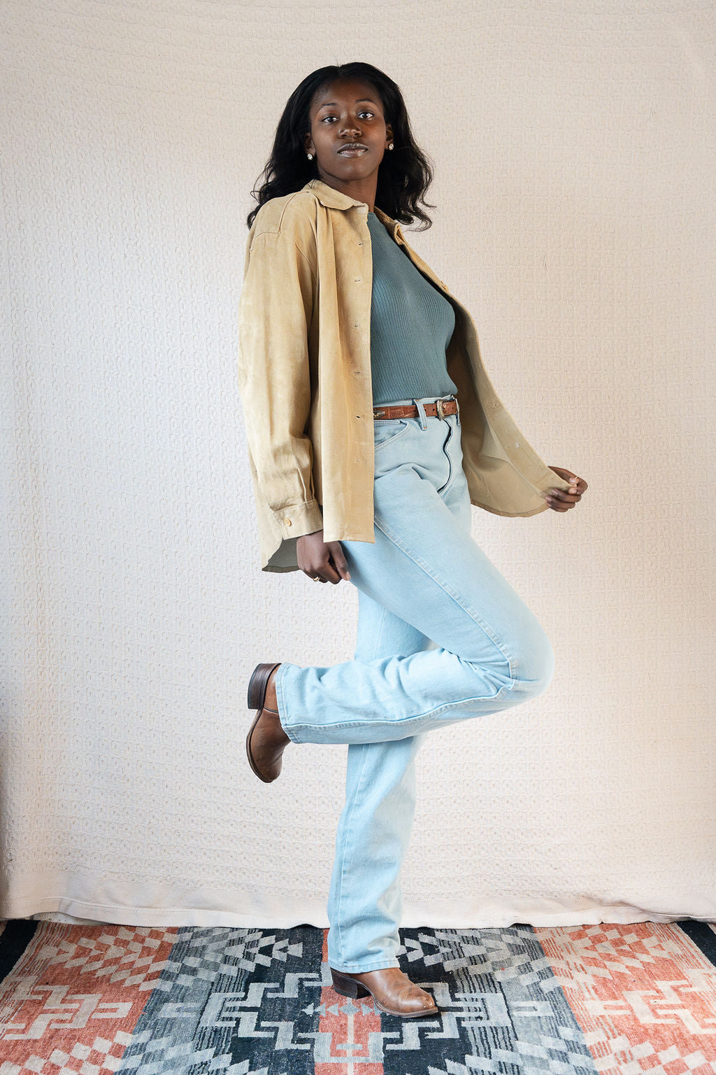 The classic suede shirt jacket that goes with literally everything. This shirt jacket by 90's brand Sarah Chapman is great for casual or date night looks. One chest pocket and a longer curved hem line keep the style simple.
